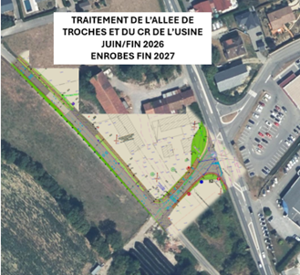 • En amont de ce giratoire provisoire, des travaux seront effectués au Chemin Rural de l’Usine et Allée de Troches pour permettre l’installation des futurs commerces