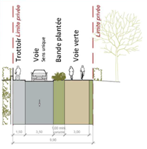 R : pour chaque voie équipée d’une voie douce, il sera prévu un trottoir pour les piétons, une voie véhicule,  une bande plantée et une voie vélos